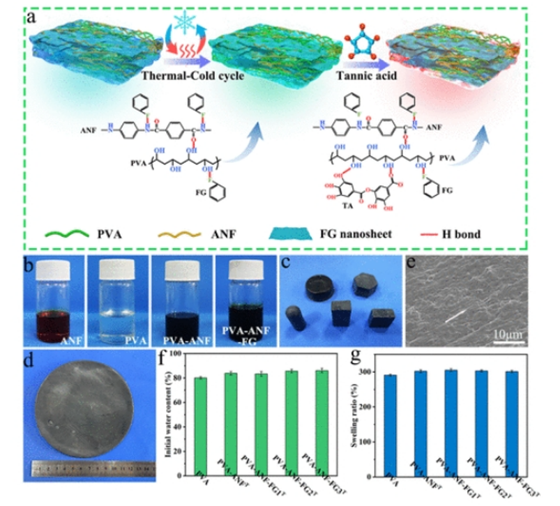 圖2. (a) PVA–ANF–FGT復合水凝膠的制備過程示意圖。(b) ANF、PVA和FG以及在DMSO中混合的照片。(c,d)不同形狀的PVA–ANF–FGT復合水凝膠。(e) PVA–ANF–FGT復合水凝膠的SEM圖像。(f) 復合水凝膠的初始含水量和(g)溶脹比。