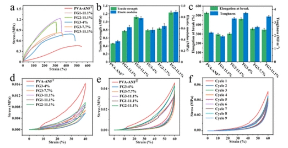 圖4.(a) 不同FG的PVA–ANF–FGT復合水凝膠的拉伸應力-應變曲線。(c) PVA–ANF–FGT復合水凝膠的斷裂伸長率和韌性。(d,e)PVA–ANF–FGT與40%和60%的不同FG復合水凝膠的循環壓縮試驗。(f) 壓縮試驗涉及9個循環,使用60%的PVA–ANF–FGT-11.1%。
