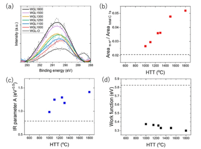圖5. 通過(a)C1s光譜、(b)π–π*振蕩衛(wèi)星峰和(C)紅外光譜表征WGL HTs的石墨層尺寸。曲線圖顯示(d)A