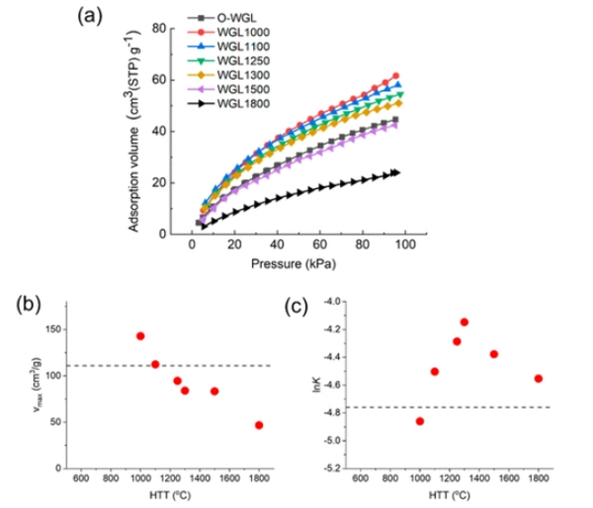 圖6. WGL HTs的氧吸附性能評估:(a)氧吸附等溫線,(b)飽和吸附量(V
