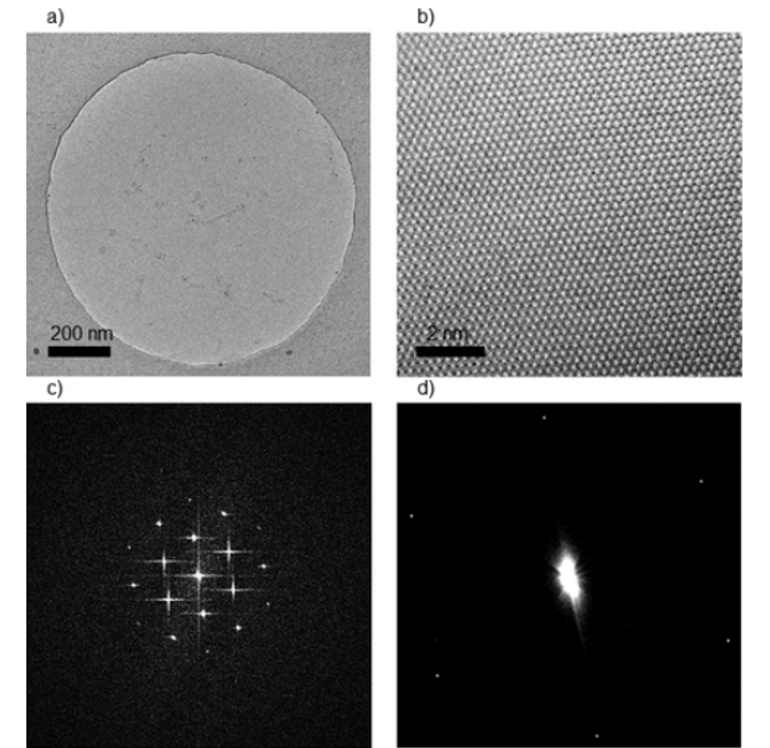 圖1. 30keV下獨立石墨烯的TEM圖像和衍射圖案:(a)低放大率TEM圖像;(b) 高分辨率TEM圖像;(c) (b)中的高分辨率圖像的FFT;(d) 在40cm的相機長度處獲得的500nm寬光束的衍射圖案。