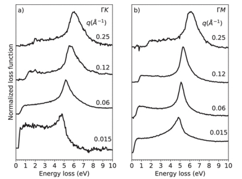 圖2. 測量了沿ΓK(a)和ΓM(b)方向取向的不同動量轉移q的獨立石墨烯的低能量損失譜。零損耗峰值已被刪除。