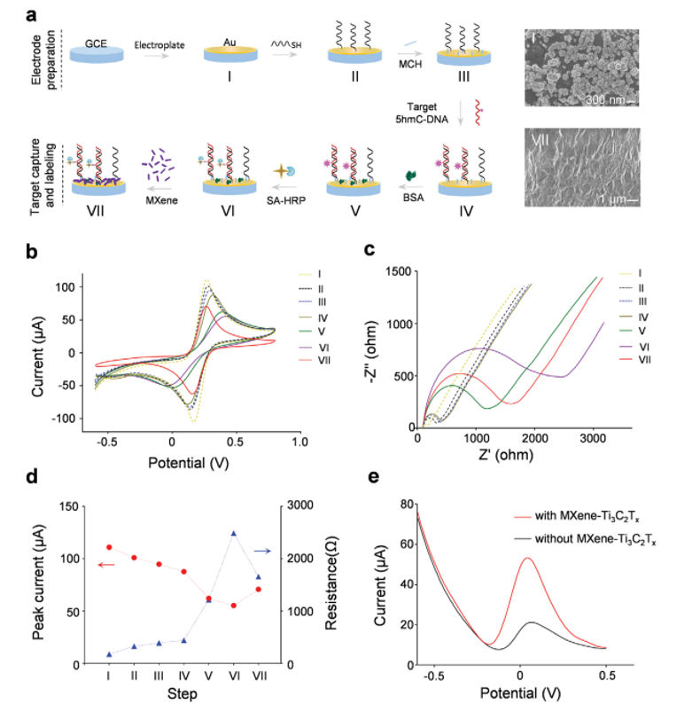 圖1. 5個hmC-DNA在復雜背景下的電化學檢測示意圖,包括樣品預處理和MXene增強的電化學檢測。