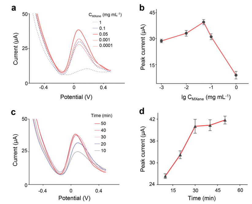 圖4. Ti3C2Tx MXene增強5hmC-DNA檢測方法的優化。