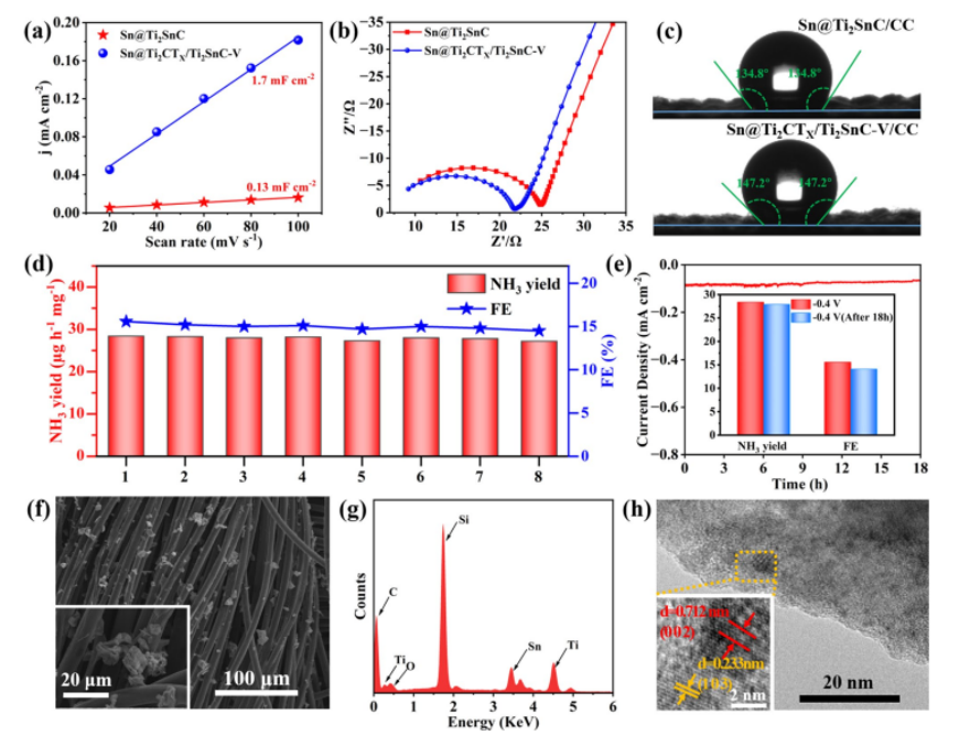 圖3. Sn@Ti2CTX/Ti2SnC–VC–V催化劑的電化學(xué)合成氨綜合性能分析。