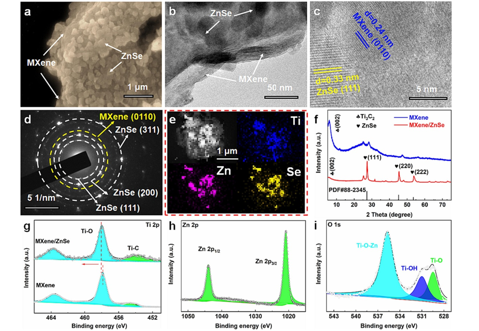 圖1. A) SEM、b) TEM、c) HRTEM、d) SAED和 e) MXene/ZnSe 的元素圖。f)樣品的XRD 圖譜。g) Ti 2p、h) Zn 2p 和 i) O 1 s 的高分辨率 XPS 光譜。