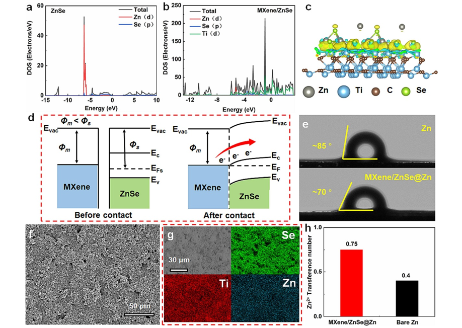圖2. a) ZnSe 和 b) MXene/ZnSe 的 DOS。c) MXene/ZnSe 的不同電荷密度的側視圖。d)金屬MXene和半導體ZnSe接觸前后的能帶圖,其中E vac、E F、E c、E v和Φ分別代表真空能、費米能級、導帶、價帶和功函數。e)電解質與不同陽極之間的接觸角圖像。f) SEM 和 g) MXene/ZnSe@Zn 的元素分布圖。h)不同陽極的Zn 2+遷移數。