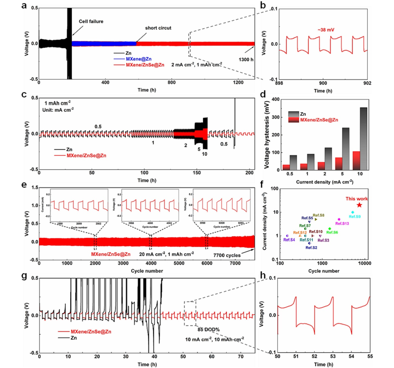 圖3. a)不同對稱電池的循環性能。b) 放大圖顯示了詳細的電壓曲線。c) 額定性能和 d) 不同電流密度下相應的電壓遲滯。e) MXene/ZnSe@Zn對稱電池在20 mA cm -2下的循環性能。f) 與之前報道的基于 MXene 的對稱電池的循環壽命比較。gh) 具有85%高 DOD Zn的不同對稱電池的電鍍/剝離曲線。