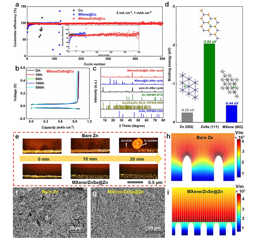 圖4. A) Zn 沉積過程的 ce。b) MXene@ZnSe@Cu 的電壓曲線。c)循環后各種電極的XRD圖譜。d) 計算出的 Zn 原子在裸 Zn (0  0  2)、ZnSe (1  1  1) 和 MXene (0  0  2) 基板上的結合能的總結。e)純鋅和 MXene/ZnSe@Zn 電極上鍍鋅的原位光學顯微鏡可視化。f) 純 Zn 和 g) MXene/ZnSe@Zn 電極經過 50 次循環后的俯視 SEM 圖像。h) 純 Zn 和 i) MXene/ZnSe@Zn 的電場分布模型。