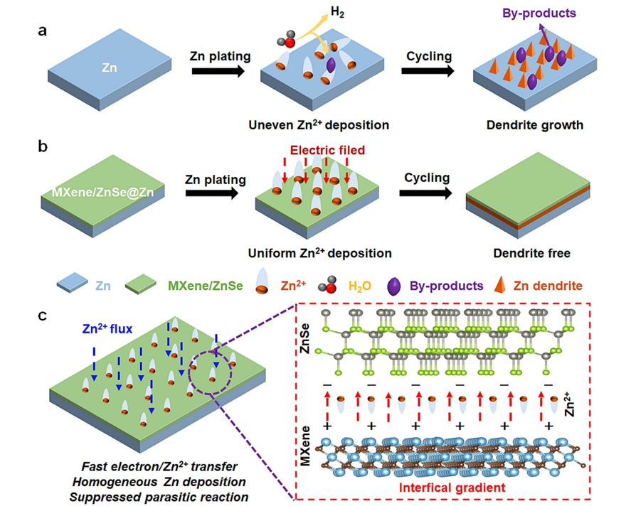 圖5. a) Zn 和 b, c) MXene/ZnSe@Zn 上的鍍鋅行為示意圖。