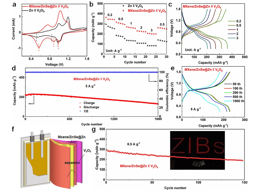 圖6. a) 0.1 mV s -1下的 cv 曲線和 b) 全電池的倍率性能。c) MXene/ZnSe@Zn||V 2 O 5電池的GCD曲線??。d) 長期循環性能和 e) 5 A/g 下的 GCD 曲線。f) AZIBs軟包電池的配置示意圖。g) MXene/ZnSe@Zn||V 2 O 5軟包電池的循環性能。插圖顯示了由我們的 AZIB 軟包電池供電的 LED。