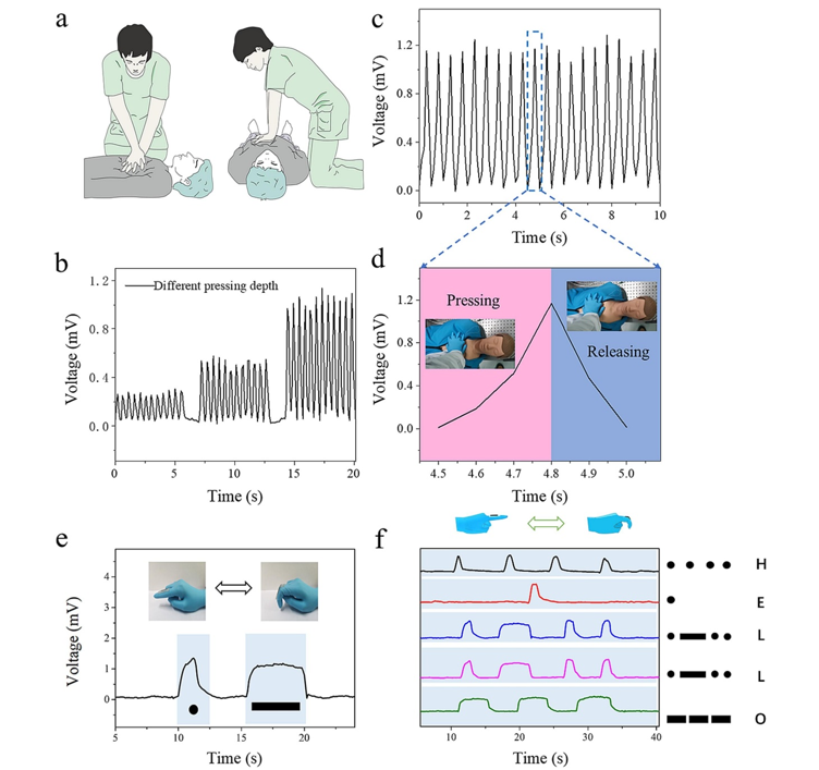 圖5. 用于心肺復蘇訓練和信息傳輸的自供電壓電傳感器。(a) CPR 標準胸部按壓姿勢示意圖。(b) 不同壓縮深度(1 cm、3 cm 和 5 cm)下傳感器的電壓響應。(c) 標準胸外按壓姿勢(5 cm)時傳感器的輸出電壓-時間曲線。(d) 電壓信號對應于完整的胸部按壓操作。(e)隨著不同彎曲程度的手指移動以記錄摩爾斯電碼中的點和劃,傳感器的電壓響應。(f) 演示生成莫爾斯電碼“HELLO”。