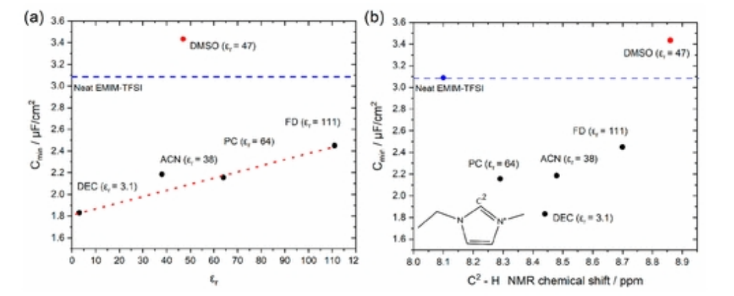 圖6. 最小電容Cmin取決于(a)用于稀釋純EMIM-TFSI的溶劑的相對介電常數εr和(b)對應于[EMIM]+陽離子結構中與C2鍵合的氫的1H NMR化學位移(見插圖),最小電容C通過對圖5中電容平臺電位區內的值(即-0.3至0.2V)取平均值來確定。水平藍色虛線顯示了從圖3所示數據中獲得的純EMIM-TFSI的Cmin值。為了清楚起見,括號中給出了所有溶劑的εr值。