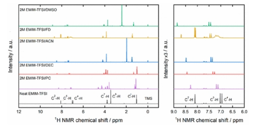 圖7. 2M EMIM-TFSI與碳酸亞丙酯(PC)、碳酸二乙酯(DEC)、乙腈(ACN)、甲酰胺(FD)和二甲基亞砜(DMSO)的混合物的1H NMR光譜。在右側面板上,給出了C2、C4和C5響應的化學位移區域的放大倍數(強度單位乘以3倍)。