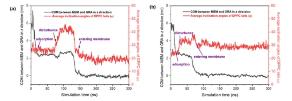 圖6. 石墨烯納米片附近DPPC尾部的平均傾角以及石墨烯納米板和DPPC膜之間的對應COM。(a) 圖2中4 nm×4 nm石墨烯納米片與純DPPC膜相互作用的情況。(b) 圖3中4×4nm石墨烯納米片與含有20%膽固醇的DPPC膜相互作用的情況。