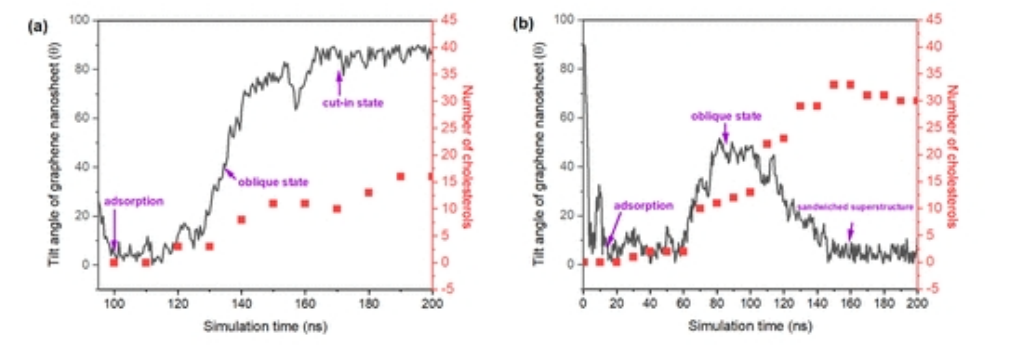 圖9 .4×4nm石墨烯片的傾斜角度以及在兩種不同的注入模式下膽甾醇的相應吸附數量。(a) 石墨烯納米片最終在細胞膜上形成一個切入狀態。(b) 石墨烯納米片最終在細胞膜中形成夾層狀態。