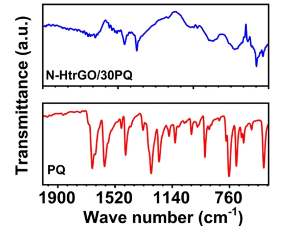 圖3. N-HtrGO/30PQ(藍色,頂部)和PQ(紅色,底部)的FTIR光譜。
