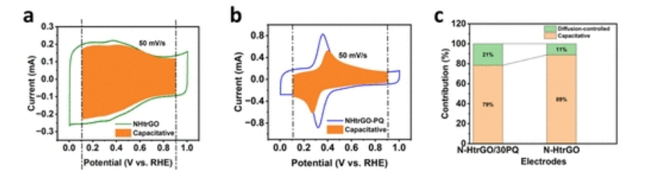 圖6.(a)N-HtrGO,(b)50 mV/s下的N-HtrGO/30PQ的CV曲線,以及(c)指示不同反應機制的貢獻的條形圖。