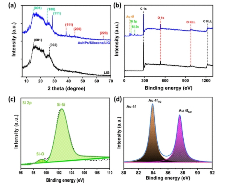 2蝕刻的硅氧烷相。(b) LIG和AuNP/硅氧烷/LIG的XPS測量光譜。(c) AuNP/siloxene/LIG的高分辨率Si2p光譜。(d) 高分辨率Au 4f光譜AuNP/硅氧烷/LIG。