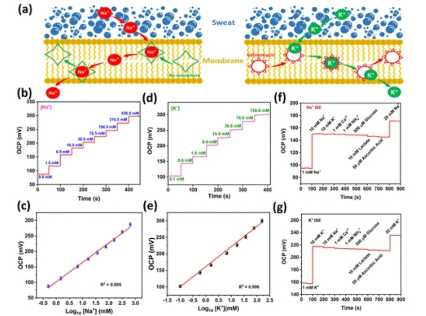 +對數濃度和OCP測量值之間的線性校準圖。(d) 在0.1至156.6mM的濃度范圍內,對K+的線性OCP響應。(e)K