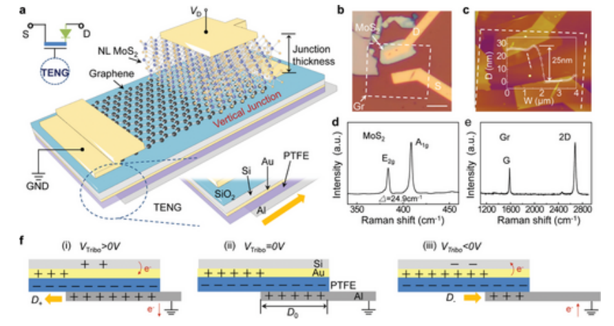 Fig 1. 示意圖和材料表征。 a)基于范德華異質結構的摩擦電子垂直場效應晶體管(VFET)的示意圖。放大圖是相應的滑模 TENG 與 VFET 的耦合。 b) 垂直堆疊的石墨烯/MoS