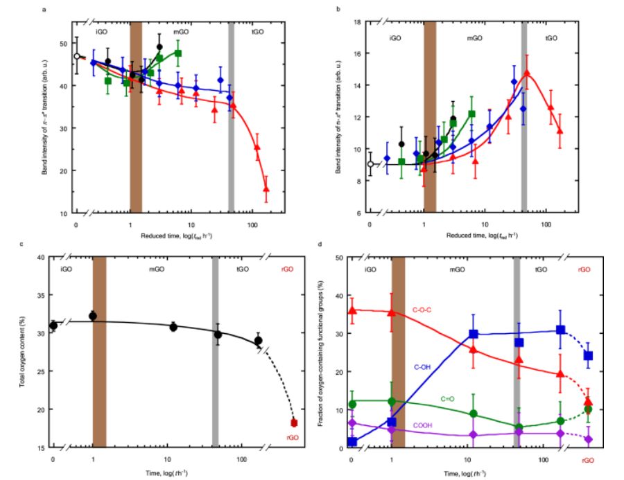 Fig 4. 成熟時(shí)結(jié)構(gòu)和 OFG 的變化。 a、b iGO、mGO 和 tGO 條帶強(qiáng)度隨成熟時(shí)間的變化。水平軸表示為減少時(shí)間(tred)的對(duì)數(shù)。 aπ-π* 躍遷, b n-π* 躍遷。成熟溫度:黑色實(shí)線和圓圈,298 K;綠色實(shí)線和方塊,308 K;藍(lán)色實(shí)線和鉆石,333 K;紅色實(shí)線和三角形,348 K。未成熟 GO 膠體的帶強(qiáng)度以空心圓圈顯示。 a、b中的誤差線代表至少三個(gè)測(cè)量的帶強(qiáng)度測(cè)定的再現(xiàn)性。 c 通過(guò) XPS 測(cè)定的總氧含量。黑圈,GO;棕色方塊,rGO。實(shí)線和虛線分別代表成熟和還原時(shí)的變化。 d 根據(jù)解卷積的 C1s 光譜確定的含氧官能團(tuán)的組成變化。不與氧原子鍵合的碳原子部分被排除在外。含氧官能團(tuán):紅線和三角形、環(huán)氧基團(tuán)(C-O-C);藍(lán)色線條和正方形,羥基 (C–OH);綠線和圓圈,羰基(C=O);紫色線和菱形,羧基(COOH)。實(shí)線和虛線分別代表成熟和還原時(shí)的變化。c、d中的水平軸表示為在348K成熟的GO成熟時(shí)間的對(duì)數(shù)。c、d中的誤差線代表不同位置的三個(gè)測(cè)量的標(biāo)準(zhǔn)偏差。棕色和灰色區(qū)域代表過(guò)渡區(qū)域。