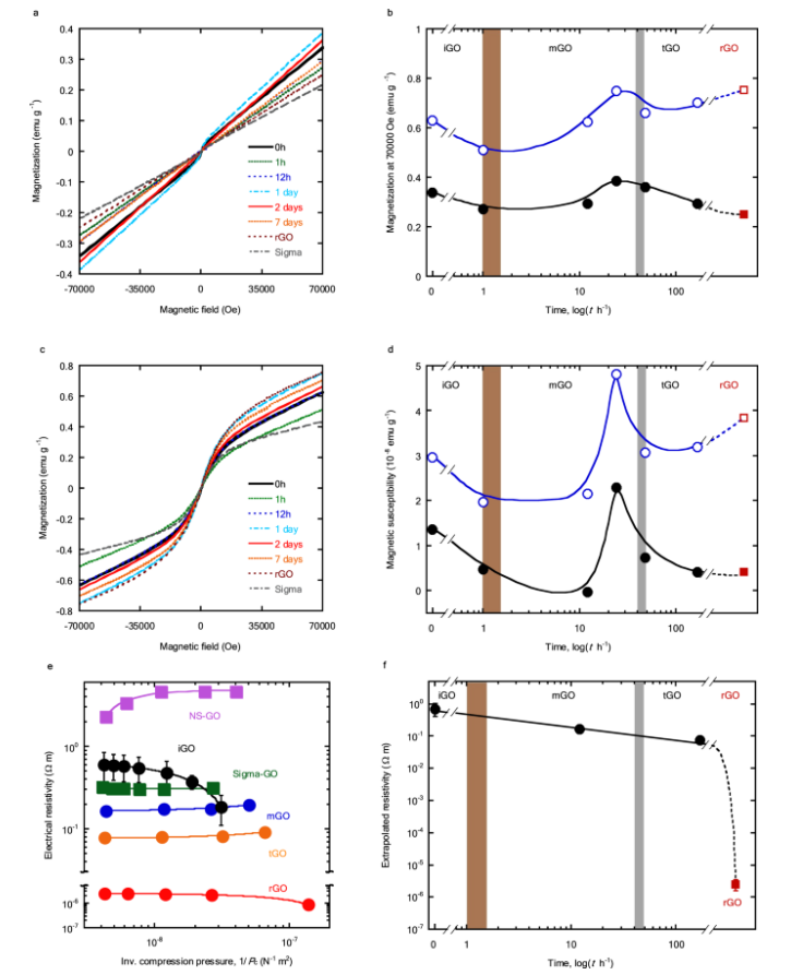 Fig 5. 348 K 下成熟的凍干 GO 和 rGO 的磁和電特性。凍干GO在348 K下成熟的a、c M-H曲線,rGO分別在298 K和1.8 K下成熟。樣品:黑色實(shí)線,0 h;綠色虛線,1小時(shí);藍(lán)色虛線12小時(shí);淡藍(lán)色點(diǎn)劃線,1 天;紅色實(shí)線,2 天;橙色虛線,7天;棕色虛線,rGO;灰色點(diǎn)劃線,Sigma-GO。b 70,000 Oe 時(shí)磁化強(qiáng)度的變化。 d 在 348 K 成熟的 GO 的磁化率從+500 Oe 變化到-500 Oe。測(cè)量溫度:黑圈,298 K;藍(lán)色空心圓圈,1.8 K。rGO 在 298 K 和 1.8 K 時(shí)的磁化強(qiáng)度和磁化率分別指定為棕色正方形和棕色空心正方形。 e 粒狀 GO 樣品的電阻率與壓縮壓力 (Pc) 倒數(shù)的關(guān)系。通過(guò)雙電極法在 10-240 MPa 的壓縮壓力下測(cè)量電阻率。黑眼圈,iGO;藍(lán)色圓圈,mGO;橙色圓圈,tGO;紅色圓圈,rGO;綠色方塊,Sigma-GO;紫色方塊,NSGO。 f 在 348 K(黑色圓圈)和 rGO(棕色方塊)下成熟的凍干 GO 的外推電阻率變化。此處,iGO 樣品是未成熟的 GO,mGO 和 tGO 樣品分別是在 348 K 下成熟 12 小時(shí)和 7 天的 GO。 e、f 中 iGO 和 rGO 的誤差線代表重復(fù)測(cè)量的再現(xiàn)性。 b、d、f 中的棕色和灰色區(qū)域代表過(guò)渡區(qū)域。