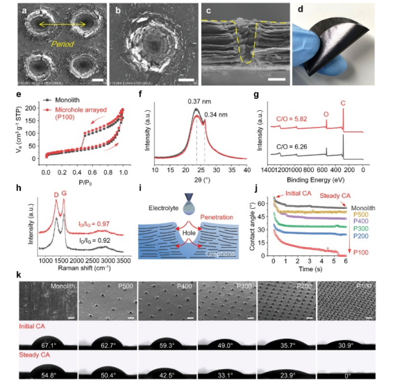 Fig 2. 微孔陣列石墨烯薄膜的特性。 a,b) 壓制前微孔陣列俯視圖的 SEM圖像。 c) 壓制后孔的橫截面SEM圖像,重疊的黃線表示孔的輪廓。比例尺:(a–c) 為 25μm。 d)微孔陣列石墨烯薄膜在彎曲狀態下的快照。 e) N2 吸附/解吸等溫線,f) XRD,g) XPS 和 h) 單片和微孔陣列石墨烯薄膜的拉曼光譜。請注意,微孔陣列電極的周期為 100μm(e-h)。 i) 微孔的圖示可以實現電解質的快速滲透。 j) 離子液體EMIMBF4在不同周期的單片和微孔陣列石墨烯電極上的動態接觸角。 k) 離子液體EMIMBF4在單片和微孔陣列石墨烯電極上的SEM圖像和相應的動態接觸角,放大倍數相同,但周期為500至100μm。比例尺:200μm。