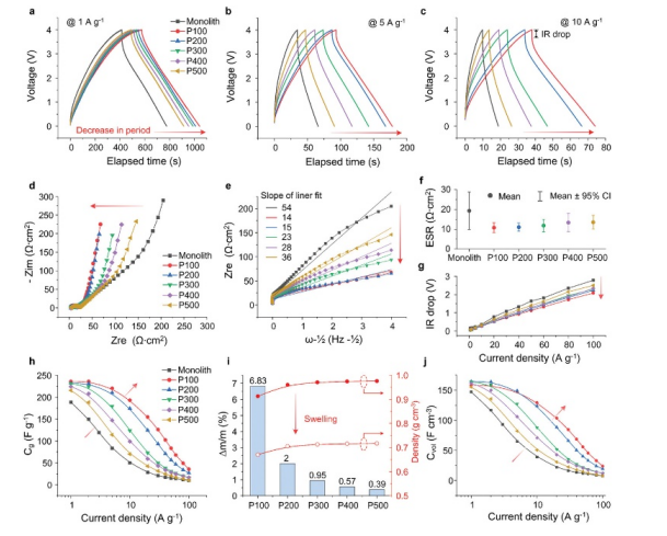 Fig 3. 人工離子擴散通道依賴于電化學性能。對于具有 4 V 電壓窗口的 EMIMBF4 中的單片和微孔陣列電極,GCD 曲線為 a) 1 A g−1、b) 5 A g−1 和 c) 10 A g−1。不同周期石墨烯超級電容器的 d) Nyquist 圖和 e) Randles 圖。 f)ESR分布和g)石墨烯超級電容器在1至100 A g−1的電流密度下不同周期的IR降。h)不同周期的rGO薄膜在1至100 A g−1的不同電流密度下的重量電容。 i)不同周期微孔陣列石墨烯薄膜的質量損失和堆積密度。 j)不同周期rGO薄膜在1至100 A g−1不同電流密度下的體積電容,質量負載約為 1 mg cm−2