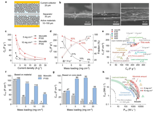 Fig 4. 高質量承載能力和實際考慮。 a) 三明治超級電容器核心堆疊示意圖。 b)不同厚度石墨烯電極橫截面的SEM圖像。 c) 質量負載為 5 和 10 mg cm−2 的單片和微孔陣列石墨烯超級電容器的重量電容與電流密度。 d) 1 A g−1 下的重量電容和 1 至 20 mg cm−2 不同質量負載下的體積分數。 e) 材料層面的重量電容和體積電容與同行的比較。縮寫:IM-rGO:IL介導的還原氧化石墨烯,UHFG:超高水平氧功能化的rGO,CMG:化學改性石墨烯。基于 f) 僅電極材料和 g) 核心堆疊在 1 A g−1 下的體積電容比較。 h) 堆疊級質量負載為 5 和 10 mg cm−2 的單片和微孔陣列石墨烯超級電容器的 Ragone 圖。