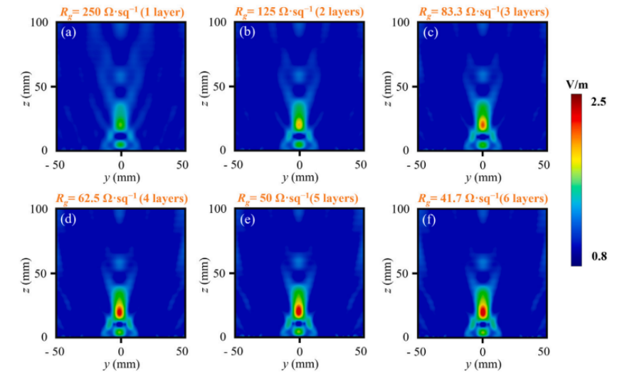 圖3. 模擬了( a )單層、( b )雙層、( c )三層、( d )四層、( e )五層和( f )六層石墨烯透鏡在30 GHz電磁波照射下的電場分布。