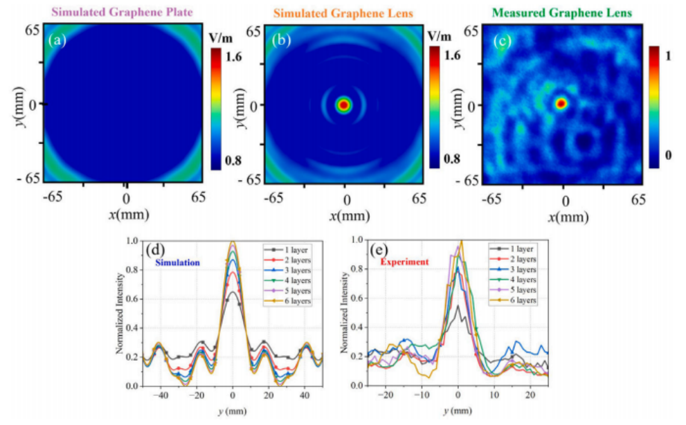 超薄菲涅耳透鏡的發(fā)展使透鏡技術發(fā)生了革命性的變化,為電磁系統(tǒng)的小型化提供了巨大的前景。盡管在微觀技術方面取得了相當大的進展,但實現超低剖面微波透鏡的可擴展制造策略仍有待開發(fā)。在這里,我們報道了一種利用石墨烯環(huán)制造超薄和基本平坦的菲涅耳透鏡的新策略。結果表明,利用石墨烯獨特的傳輸特性單層或多層石墨烯可以微結構化成菲涅耳透鏡。我們設計了不同的菲涅耳透鏡,并通過數值和實驗研究了它們在微波狀態(tài)下的性能。結果表明通過改變石墨烯的層數,可以在不改變聚焦點的情況下改變聚焦波的強度。我們的實驗結果與數值模擬的結果之間的良好一致性證明了原子厚度(工作波長約為10−7)石墨烯基透鏡的可行性,并顯示了它們在超緊湊集成方面的潛力。