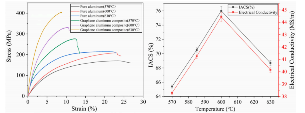 圖2. 不同燒結溫度下銅涂層石墨烯增強鋁復合材料的應變-應力曲線(a)和電導率(b)。