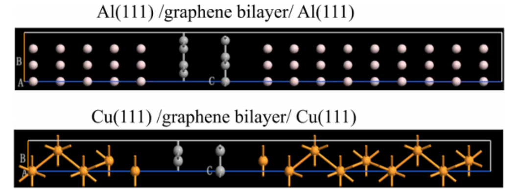 圖9. 基于第一性原理計算的Al ( 111 ) /雙層石墨烯/ Al ( 111 )和Cu ( 111 ) /雙層石墨烯/ Cu ( 111 )兩種模型體系中相鄰原子對雙層石墨烯(含有兩個碳原子)中原胞的電子摻雜濃度模型。雙層石墨烯以AB堆積構型排列,其中白色和灰色球分別代表Al ( 111 ) /石墨烯雙層/ Al ( 111 )模型體系中的鋁( Al )和碳( C )原子。黃色和灰色球分別代表Cu ( 111 ) /石墨烯雙層/ Cu ( 111 )模型體系中的銅( Cu )和碳( C )原子。