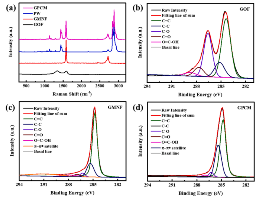 圖2. (a) GOF、PW、GMNF和GPCM的拉曼光譜;C1s的XPS光譜:(b)GOF; (c)GMNF; (d)GPCM。