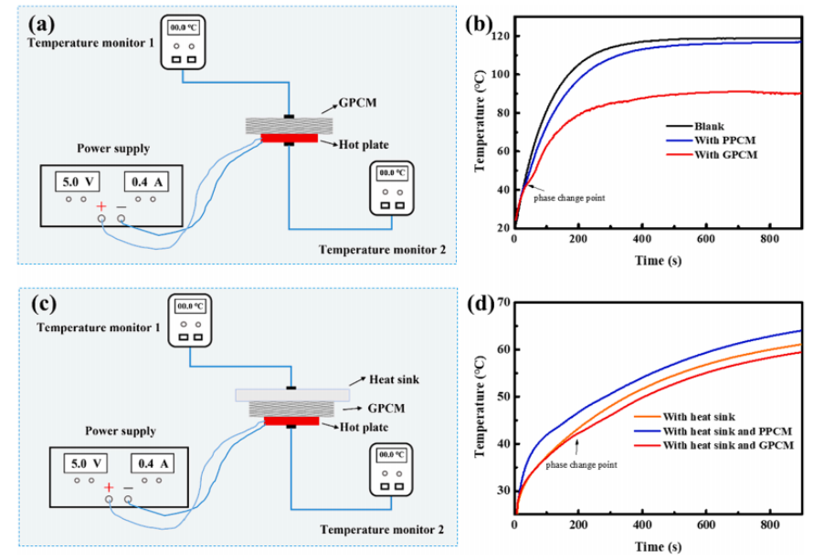 圖4. (a)GPCM和PPCM附著在熱板上時的模擬實驗設(shè)置示意圖;(b) 圖a中熱板相應(yīng)的溫度變化;(c)GPCM和PPCM作為TIMs時的模擬實驗設(shè)置示意圖;(d)圖c中熱板相應(yīng)的溫度變化。