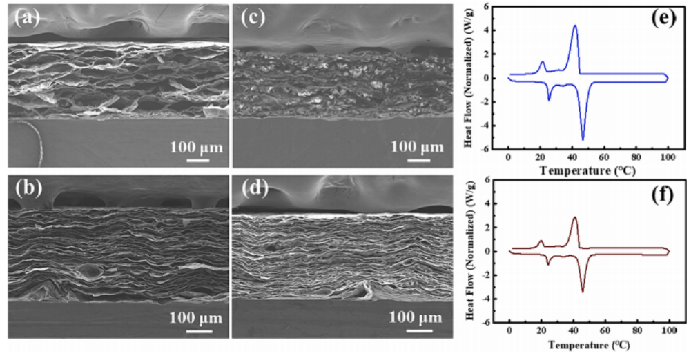 圖5. SEM圖像:(a)GMNF-1; (b) GMNF-2; (c) GPCM-1; (d) GPCM-2;DSC曲線:(e)GPCM-1; (f) GPCM-2。