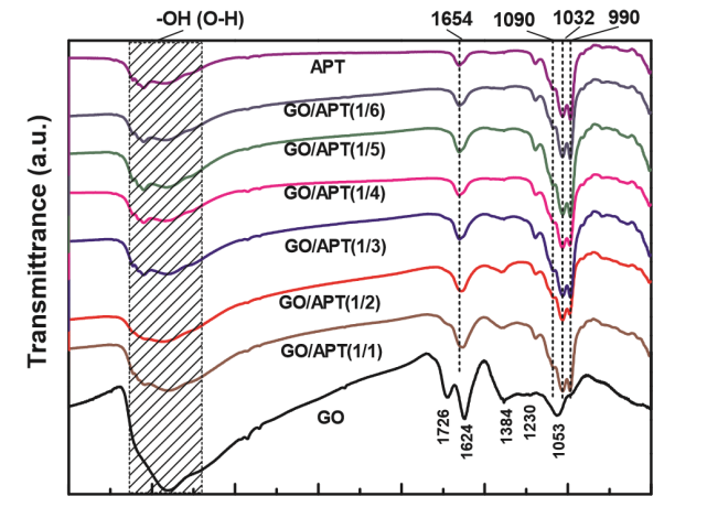 Fig 3. GO、APT和GO/APT復合材料的FT-IR光譜。