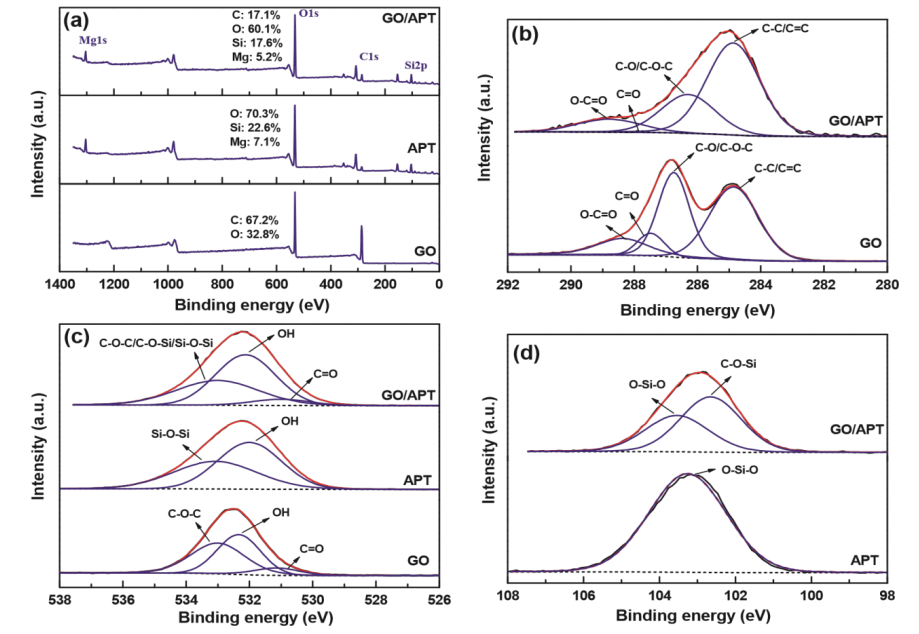 Fig 4. (A)GO,APT,GO/APT(1/4)復合材料的XPS測量,以及相應的(B)C 1s,(C)O 1s和(D)Si 2p譜。圖中顯示了原始數(shù)據(jù)(黑線)、背景(黑虛線)、擬合線(紅線)和去卷積峰(藍線)。