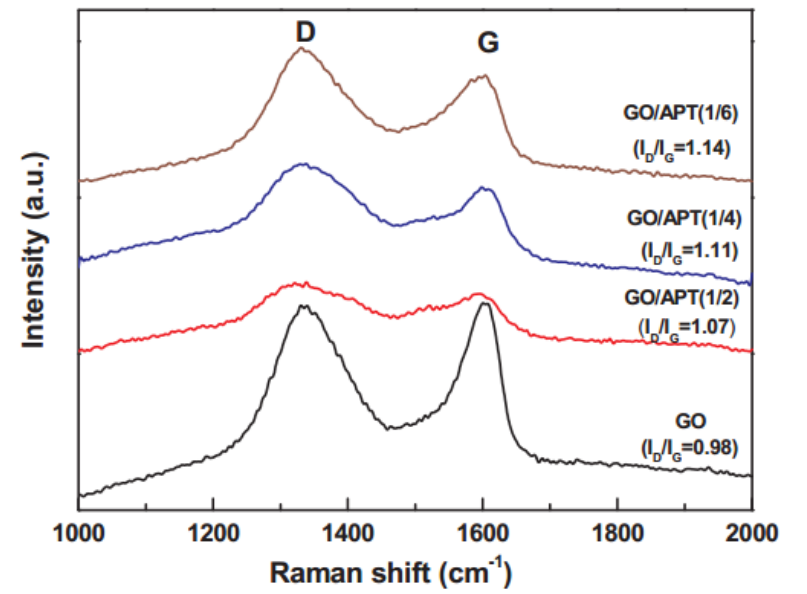 Fig 5. GO和GO/APT復合材料的拉曼光譜。