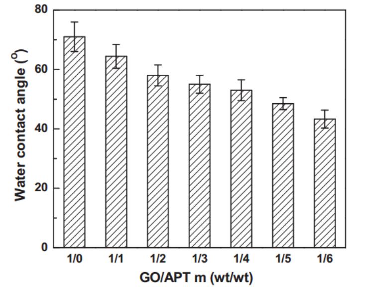 采用真空輔助過濾技術成功制備了氧化石墨烯/凹凸棒石(GO/APT)復合膜,用于染料廢水的高效處理。通過紅外光譜、X射線光電子能譜、拉曼光譜、X-射線衍射儀和場發(fā)射掃描電子顯微鏡的表征,證實了APT納米棒通過接枝改性形成了GO層間距(d-間距)、膜表面微觀結構(層形態(tài)、結構和親水性)甚至水分離性能。與原始GO膜相比,隨著APT/GO比例的增加,GO/APT膜的d間距從0.90 nm逐漸增大到1.07 nm,而水接觸角從71.0°減小到43.3°。此外,GO/APT膜具有粗糙的層次化結構和較高的表面親水性,這與較大的層間距相結合,可以協(xié)同提高分離性能。在優(yōu)化條件下,對7.5 mg L