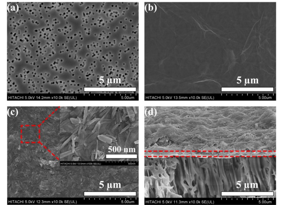 Fig 9. (A)PC載體、(B)原始GO膜和(c,d)GO/APT(1/4)膜的FESEM圖像。