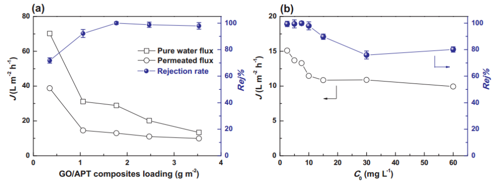 Fig 10. (A)GO/APT復合材料負載量和(B)Rh B進料濃度對GO/APT(1/4)膜分離性能的影響。