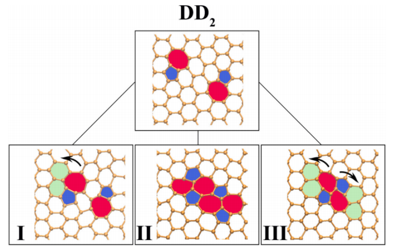 2和三種類型的動力學事件:(I)滑移;(II)形成新的形成缺陷;(III)位錯相互向對方運動。五原子環呈藍色,七原子環呈紅色。DD之前的位置用綠色的六原子環表示。黑色箭頭表示位錯的運動方向。