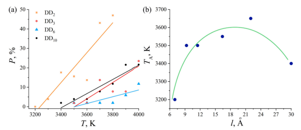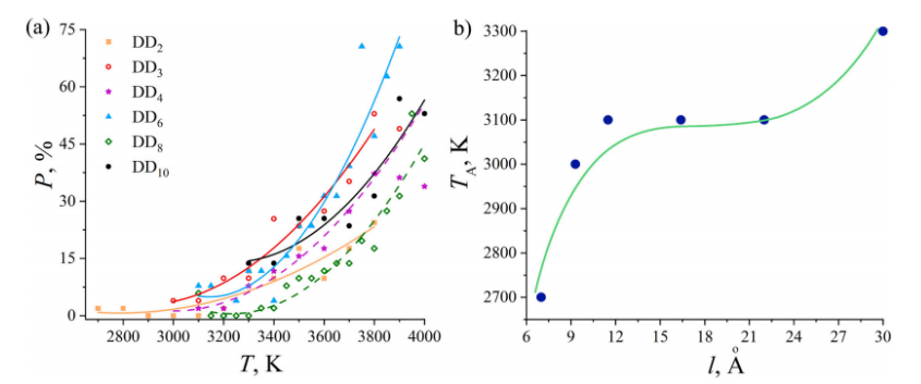 10的代表性樣品,SW缺陷形成的概率P與溫度的函數。符號表示數值型數據,實線表示逼近曲線。(b)SW缺陷形成開始的溫度與偶極臂的函數。
