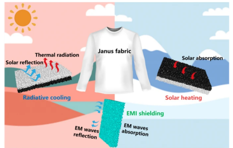 圖1. 集成輻射制冷、太陽能加熱、EMI屏蔽功能的Janus織物在冷熱室外環境下的應用示意圖。輻射冷卻是通過高太陽反射和高 ATW 發射來實現的。太陽能加熱是通過高太陽能吸收來實現的。通過反射和吸收入射電磁波來實現 EMI 屏蔽。