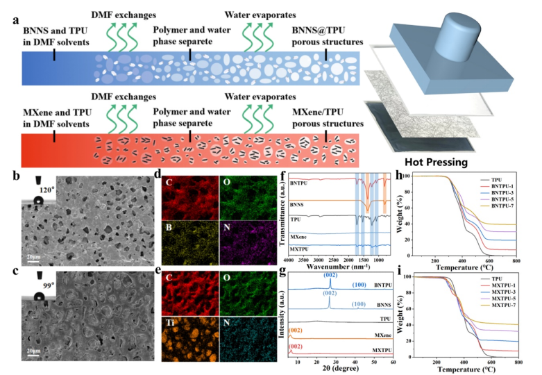 圖2. Janus 織物的制造過程示意圖。 b BNNS@TPU 織物的 SEM 圖像,插圖顯示水接觸角。 c MXene/TPU 織物的 SEM 圖像,插圖顯示水接觸角。 d BNNS@TPU 織物的元素分布圖。 e MXene/TPU 織物的元素分布圖。 f TPU、BNNS、BNNS@TPU、MXene 和 MXene/TPU 的紅外光譜。 g TPU、BNNS、BNNS@TPU、MXene 和 MXene/TPU 的 XRD 圖。 h TPU、BNPU-1、BNPU-3、BNPU-5 和 BNPU-7 的熱重圖。 i TPU、MXTPU-1、MXTPU-3、MXTPU-5 和 MXTPU-7 的熱重圖。