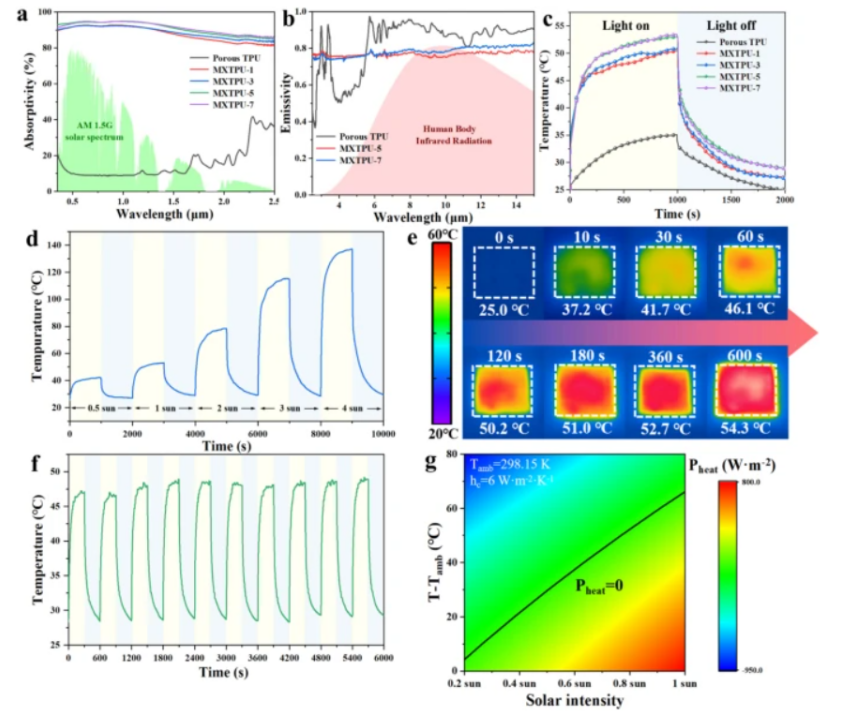 圖4. a TPU、MXTPU-1、MXTPU-3、MXTPU-5 和 MXTPU-7 的太陽吸收率光譜。 b TPU、MXTPU-5 和 MXTPU-7 的紅外發射率光譜。 c TPU、MXTPU-1、MXTPU-3、MXTPU-5和MXTPU-7在1太陽輻照度下的溫度-時間曲線。 d 不同太陽輻照度下MXTPU-7的溫度-時間曲線。 e MXTPU-7 在 1 個太陽輻照度下的紅外熱圖像。 f MXTPU-7 在 1 太陽輻照度下的循環穩定性。 g 不同太陽輻照度下MXTPU-7的加熱功率