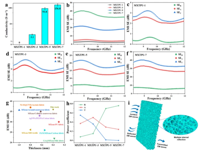 圖5. a MXTPU-1、MXTPU-3、MXTPU-5 和 MXTPU-7 的電導率。 b MXTPU-1、MXTPU-3、MXTPU-5 和 MXTPU-7 的 EMI SE。 c–f MXTPU-1、MXTPU-3、MXTPU-5 和 MXTPU-7 的特定 EMI 屏蔽組件:SER、SEA 和 SET。 g MXTPU-7 與其他屏蔽織物的厚度和 EMI SE 性能比較。 h MXTPU-1、MXTPU-3、MXTPU-5 和 MXTPU-7 的功率系數。 i MXene/TPU 織物電磁波耗散機制圖解。
