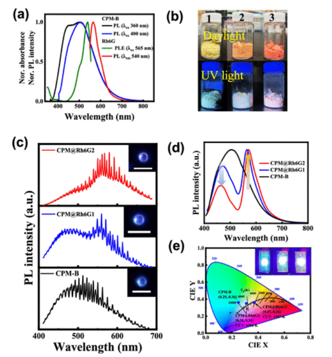 圖 6. (a) CPM-B 和 PLE 的歸一化 PL 光譜以及 Rh6G/PVA 薄膜的 PL 光譜。 (b) 摻入 CPM-B 和 Rh6G 的微球在日光和紫外光下的照片。 (c, d) 使用 355 nm UV 激光激發和相應 WLE 的 WGM 發射(比例尺 20 μm)。 (e) WLE 的 CIE 坐標。插圖顯示了 400 nm 光激發下的直接 WLE 照片。